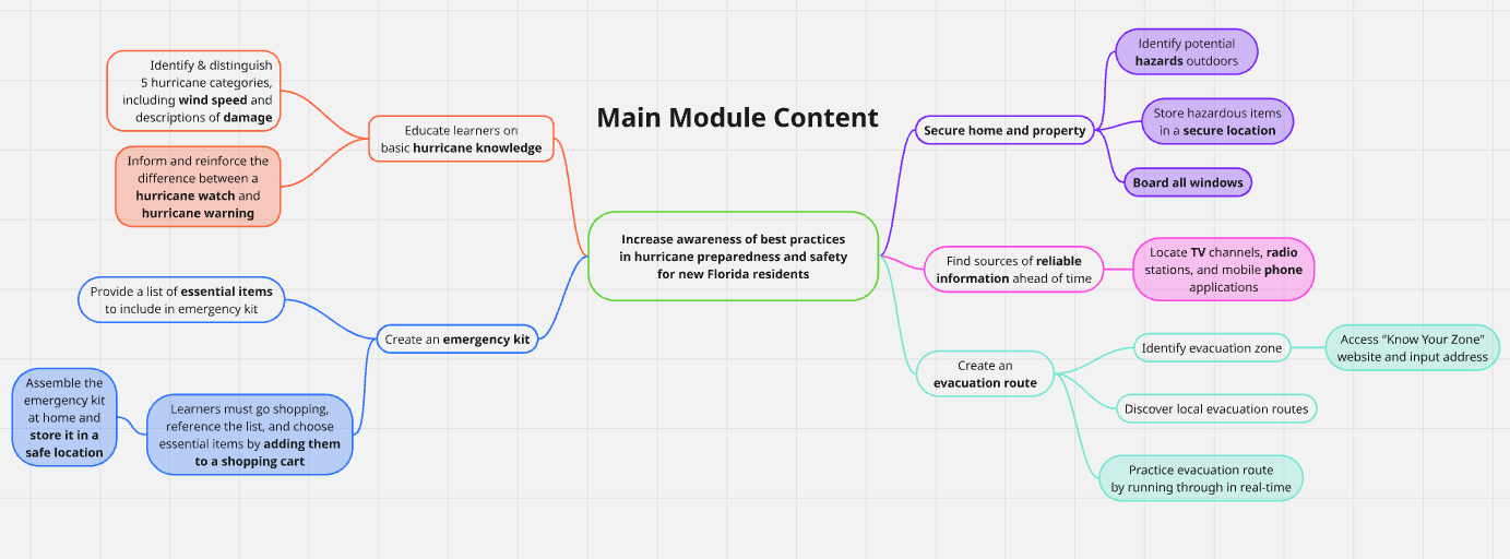 Analysis began with conversations with a recent Florida transplant—a family friend—in which the importance of the idea clicked. I then incorporated Cathy Moore’s Action Mapping, my favored framework for identifying the high-priority actions that will best achieve the desired behavioral change. In this case, I asked: What are the real-world actions that will best prepare a new Florida resident for an oncoming hurricane?